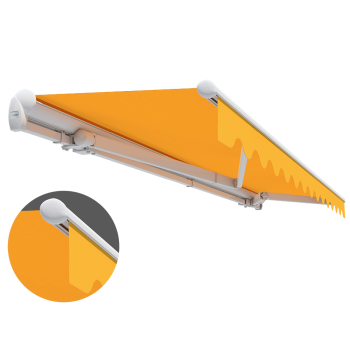 Bei eingefahrener Markise schließt das Ausfallprofil die Kassette vollständig. So werden Tuch und Technik zuverlässig vor Witterungseinflüssen.geschützt. -
