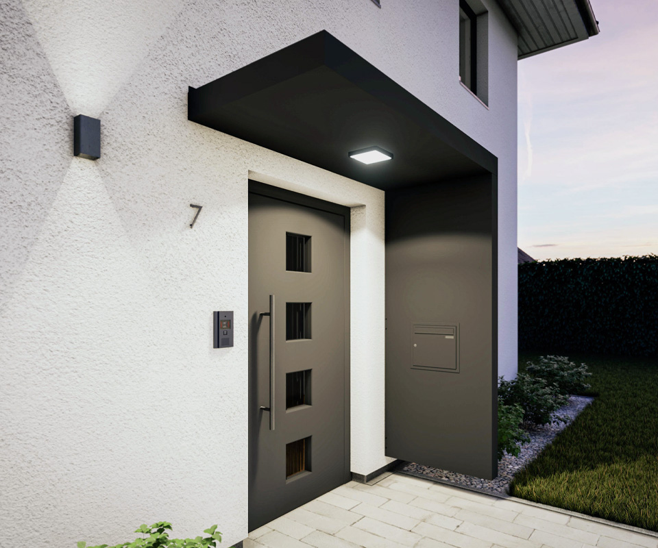 - Als kleinste Dachvariante dient die Eingangsüberdachung zum Schutz vor Regen, Wind und Schnee vor der Eingangstür. Natürlich sind auch hier die Eindeckungsmöglichkeiten VSG und Polycarbonat möglich. Sehr gerne wird hier auch die integrierte LED-Möglichkeit verbaut.